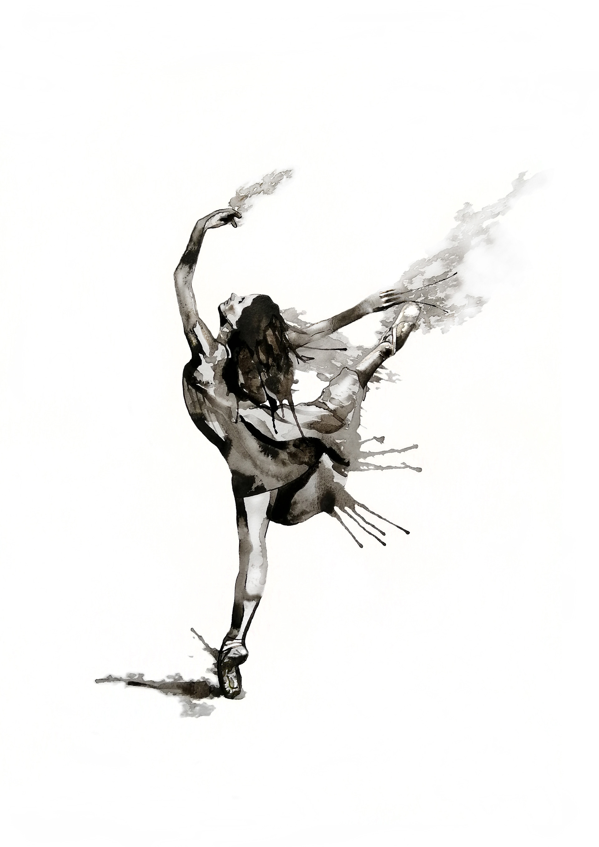 inky watercolour lends intself beautifully to this balletic pose - the watery spray marks and splodges add to the sense of movement. A3 prints available from my