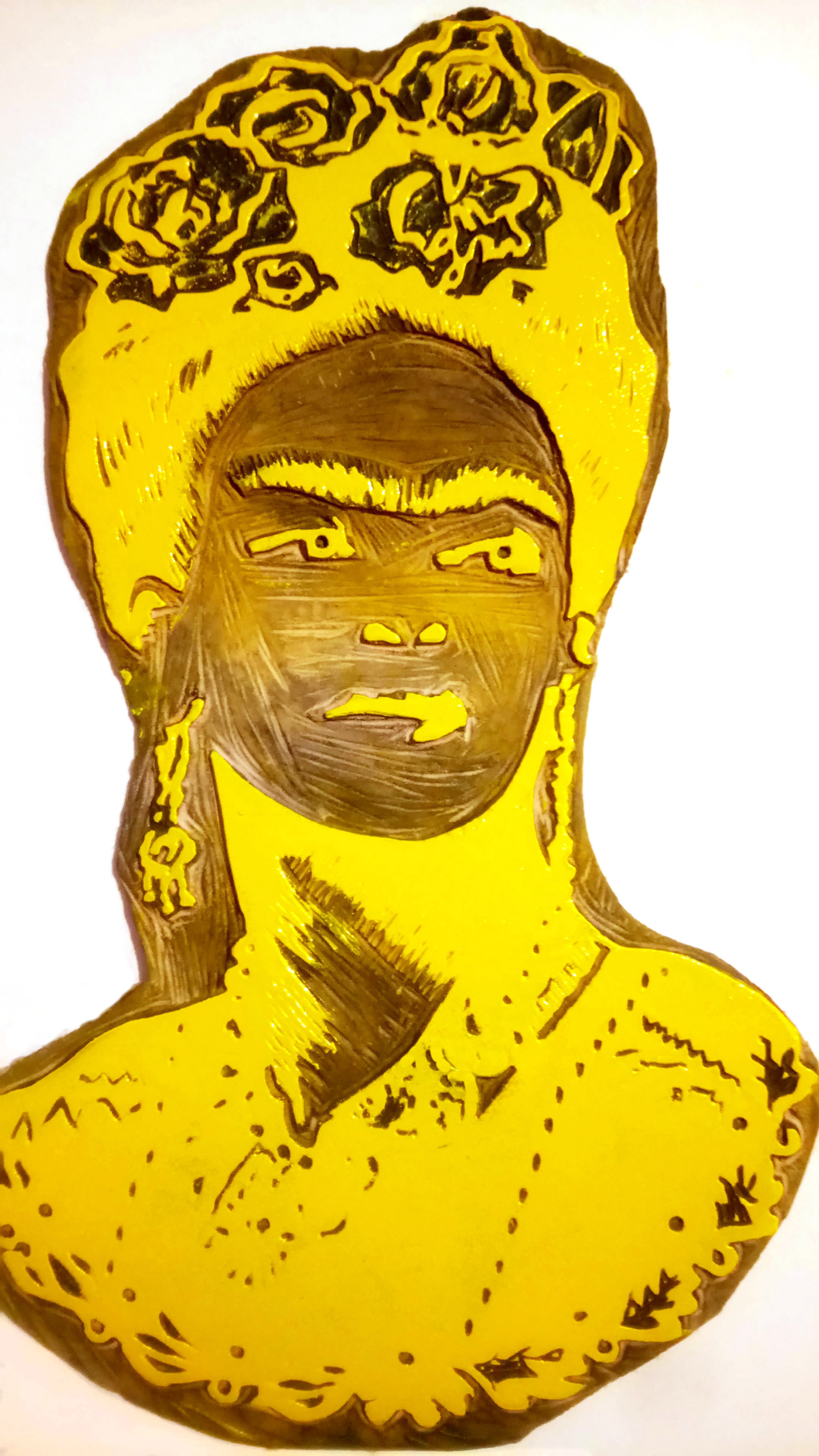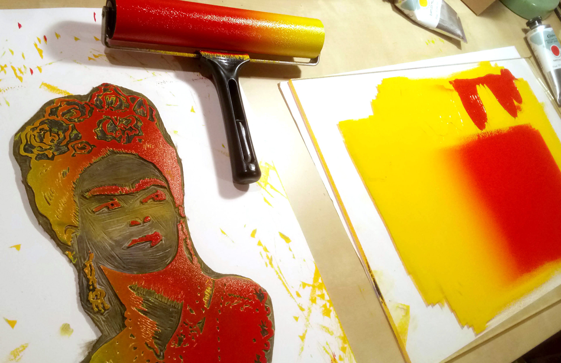 Frida was one of my first linocut prints. I wanted to capture her the essence of her in a bold, simplified design. The 'sunset' print run was created by blending red and yellow inks with the roller.