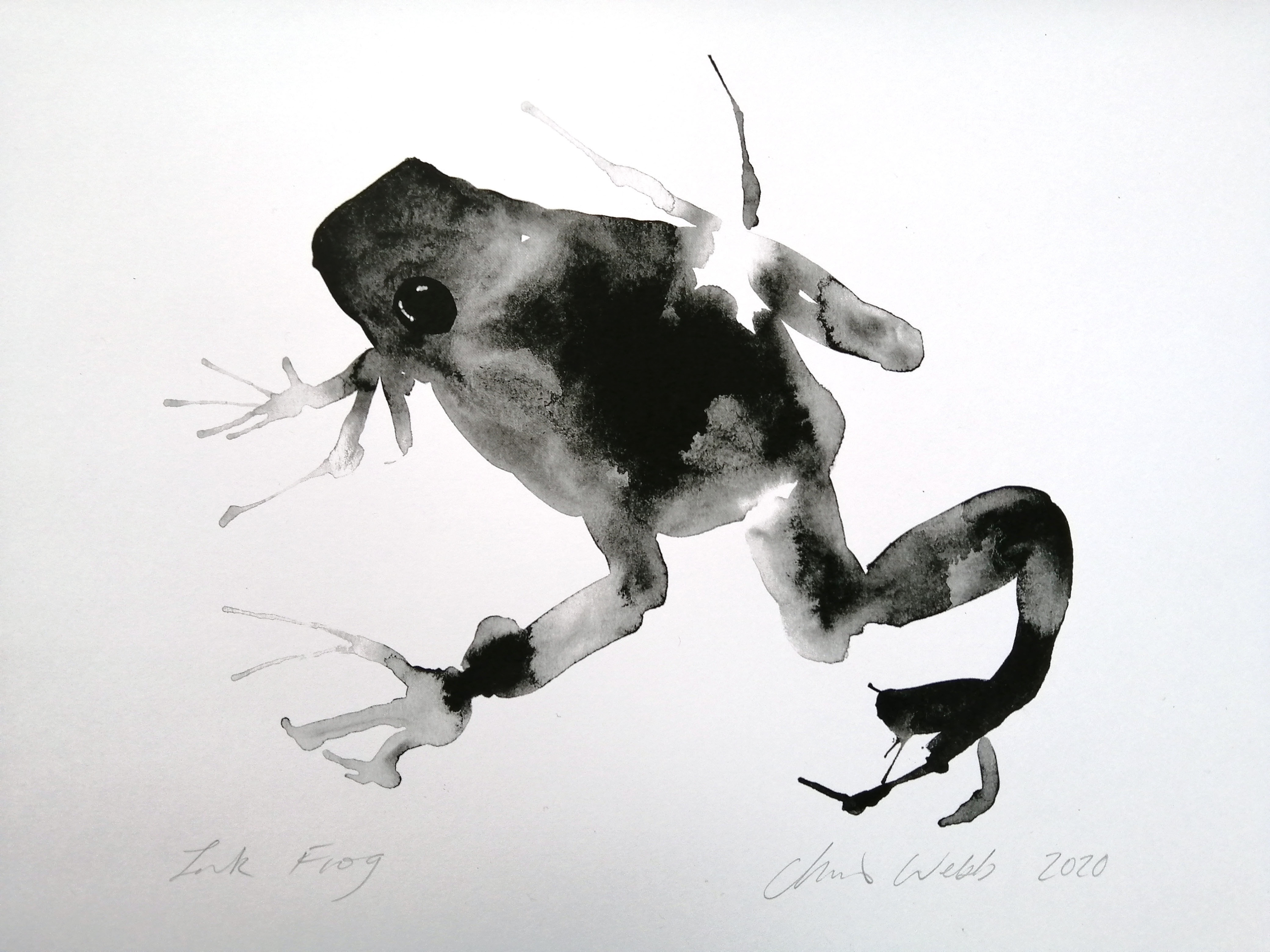 I had a lot of fun painting this little fella: painting the complete form in clear water as quickly as I could and then repeatedly loading my brush with ink, allowing the pigment to react spontaneously and freely with the wet surface. The final step, done as the paper still had some dampness to it, was to squirt water onto the frog's feet, creating loose elongated shapes.
